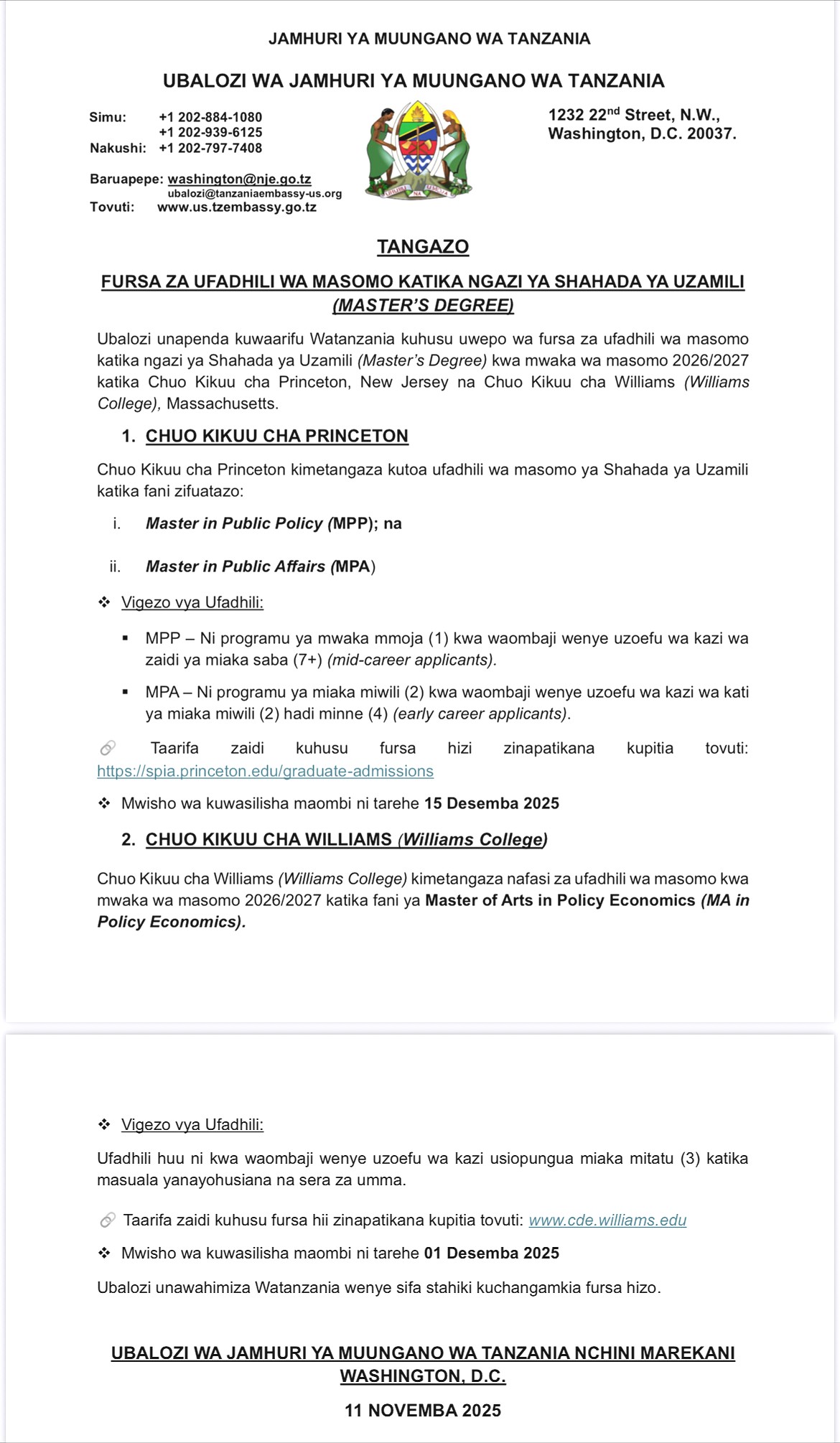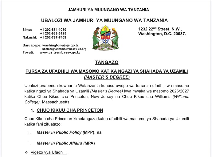 FURSA ZA UFADHILI WA MASOMO KATIKA NGAZI YA SHAHADA YA UZAMILI - MASTER’S DEGREE