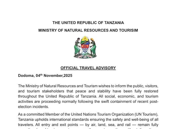OFFICIAL TRAVEL ADVISORY NOTE FROM THE MINISTRY OF NATURAL RESOURCES AND TOURISIM - NOVEMBER 2025 Read More