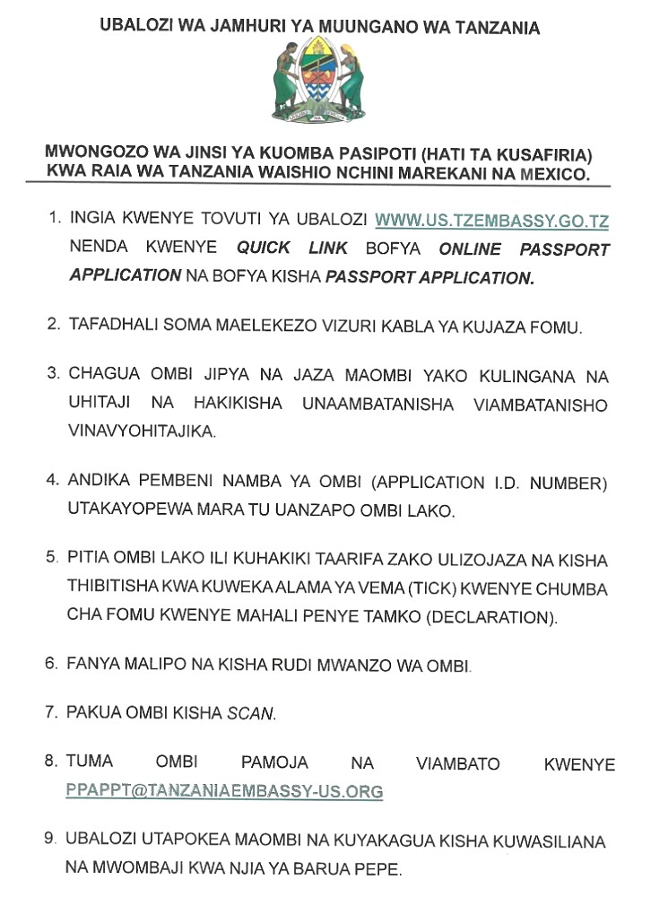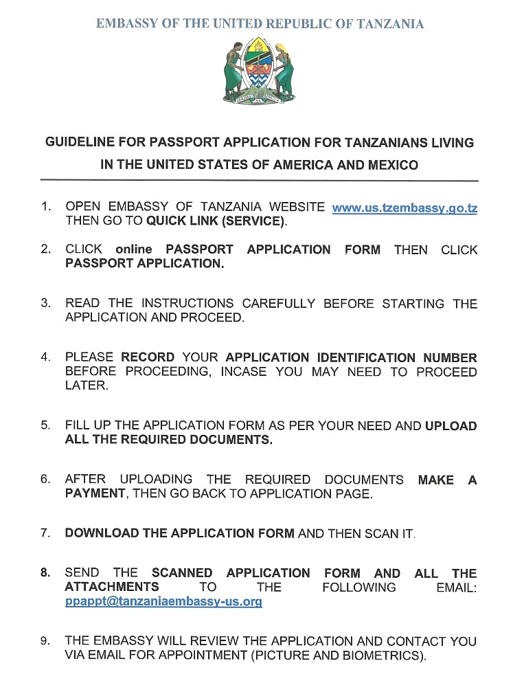 GUIDELINE FOR PASSPORT APPLICATION FOR TANZANIANS LIVING IN THE UNITED STATES OF AMERICA AND MEXICO