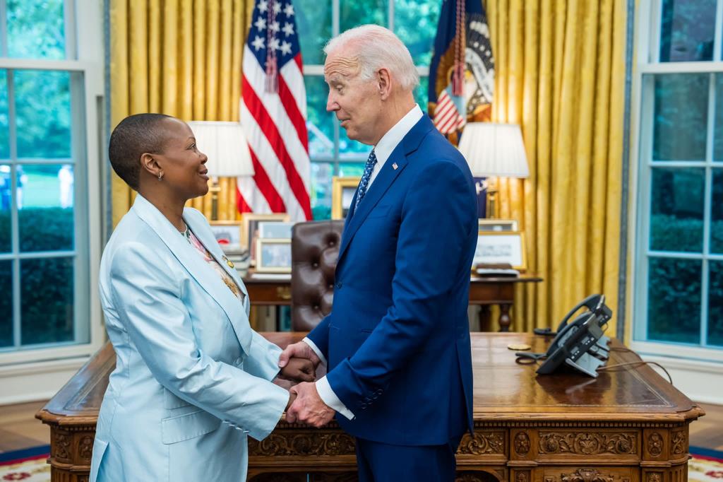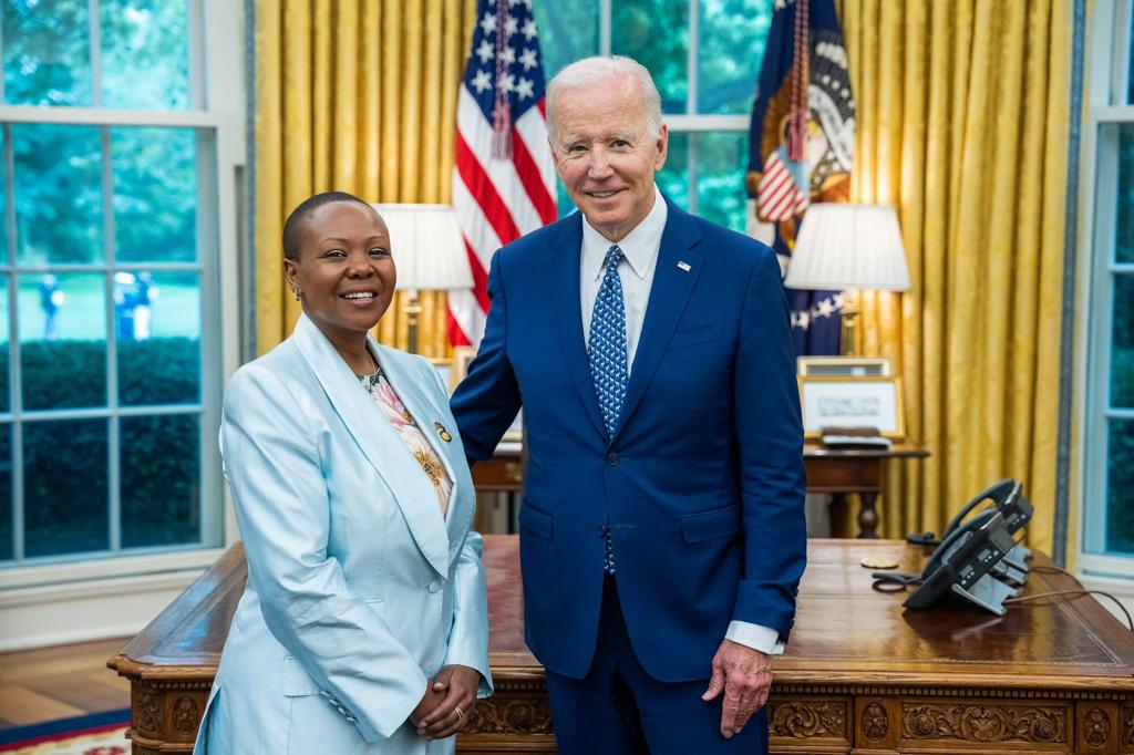 Rais wa Marekani Joseph R. Biden, akiwa na Balozi wa Jamhuri ya Muungano wa Tanzania Nchini Marekani Dr Elsie S. Kanza katika Ikulu ya Marekani, Washington, D.C. Udumu Uhusiano kati ya Tanzania na Marekani! #Miaka61Pamoja